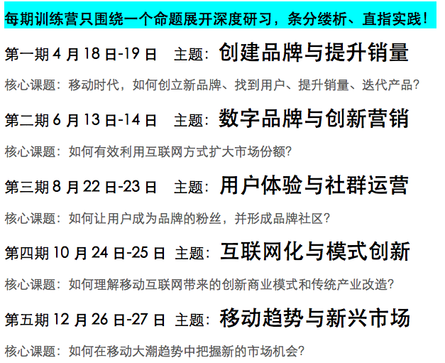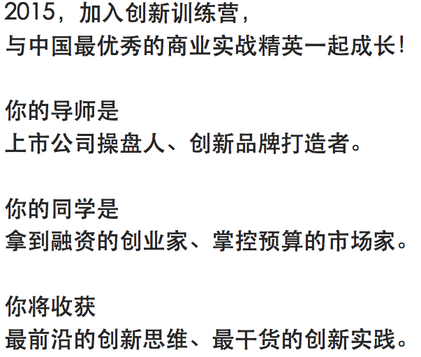 创新训练营是中国首个创新实战的系列课程,每两月开营一期、每期2天。围绕数字技术发展带来的商业机会,课程将紧密围绕“掌握互联网创新方法,提升个人能力和工作绩效”的目标开展,从创新知识到实际操作、从思维激发到行为指导、从个案分析到行业趋势,全方位的为学员提供系统知识。