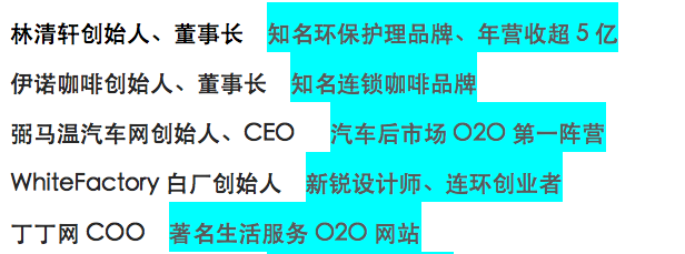 训练营的导师全部来自顶级互联网公司、500强品牌商、知名创业公司的一线高管和创始人。训练营的学员全部来自品牌商的中高层、拿到A+轮以上的创业家。