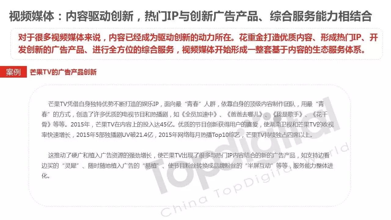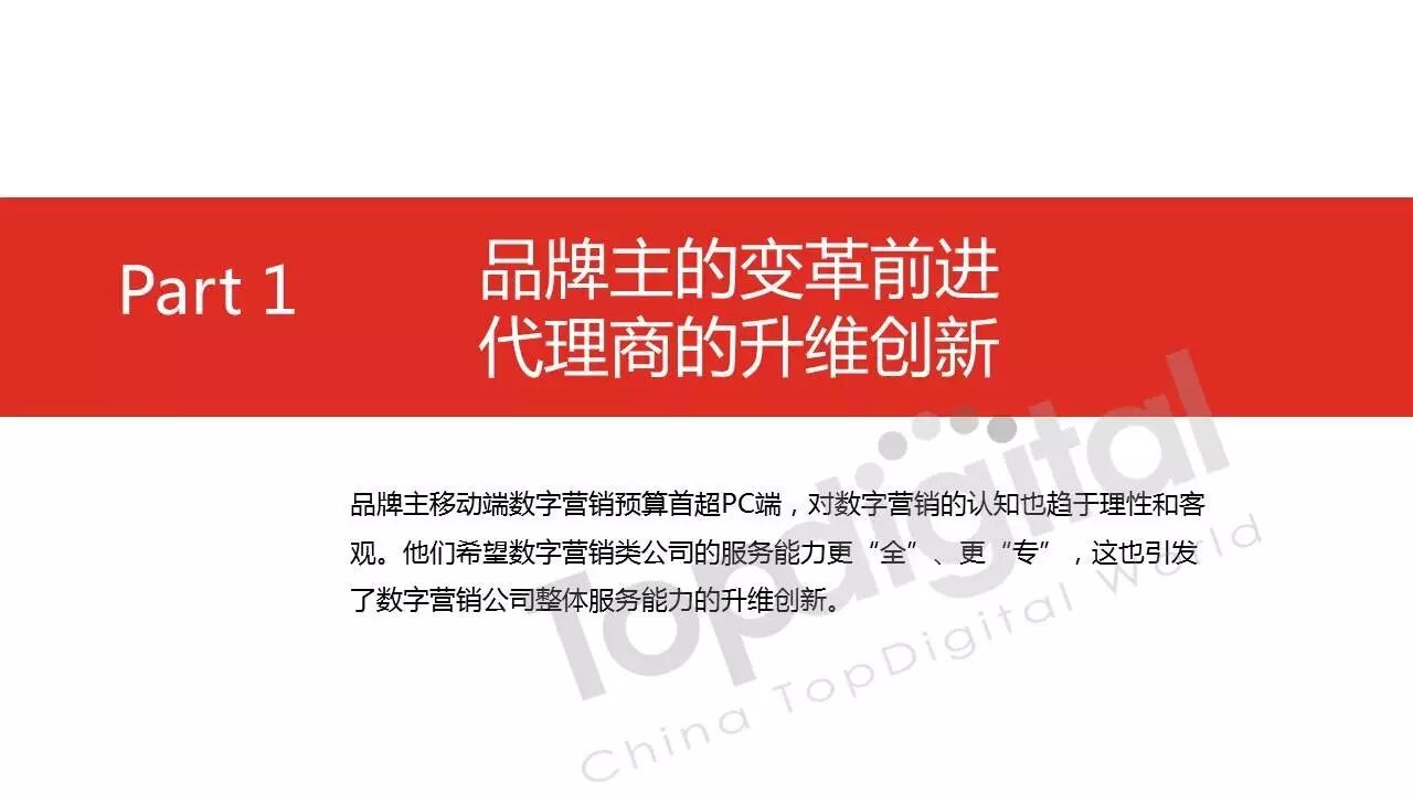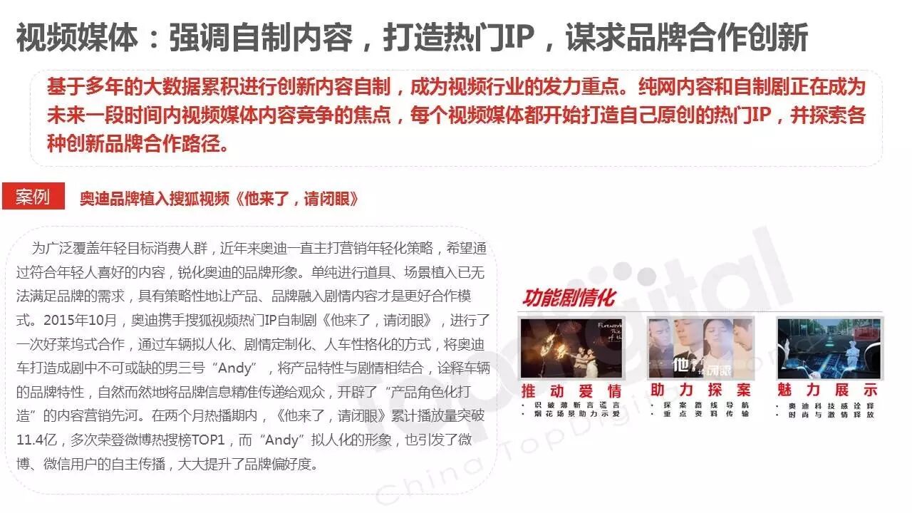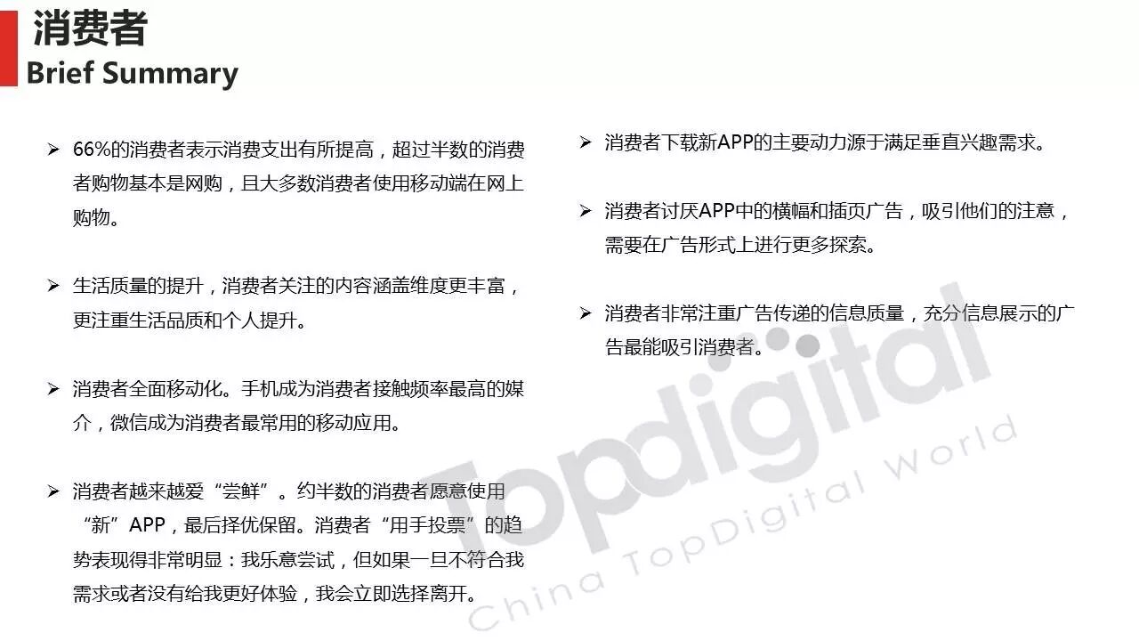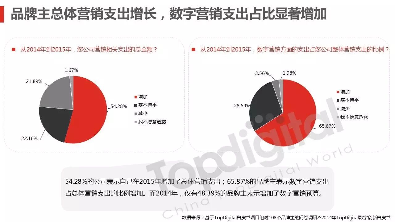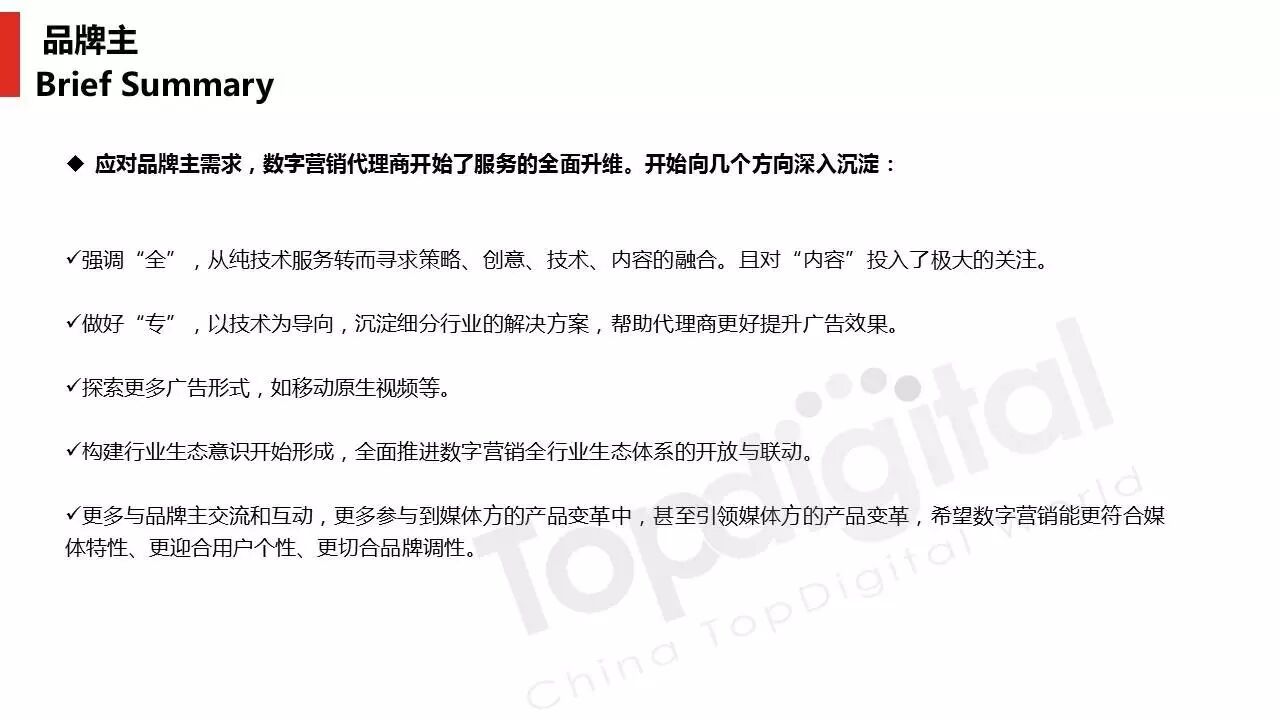 《2015-2016 TopDigital数字创新白皮书》发布,解读数字行业进化趋势 2016年4月8日 0 从2015到2016,伴随着移动端场景的延伸和数字技术的发展,数字传播领域也前所未有地热闹起来,AR&VR、跨屏、海淘和跨境购、移动支付等新玩法和新场景不断涌现和深化,超级“IP”出现,智能硬件、共享经济成为关注热点,新的营销渠道、新的沟通方式层出不穷。 面对这样的环境和市场格局,TopDigital研究院深入整个数字行业的品牌主、代理商、消费者和媒体进行了行业全景式研究和解读。在过去的一年里,品牌主开始变革思维不断前进;这也促使数字营销的代理商加快了升维创新的步伐;同时消费者的消费水平不断提高,品质生活导向的消费升级正在进行;而媒体正在进入衰亡、重生与创变的关键时刻…… 同时,这一份年度数字创新白皮书,延续了TopDigital研究院一贯的风格,除了数据的采集解读,也更多从“人”的角度出发,去理解和认识行业的发展进化。报告通过前期采访,吸收了众多行业大咖的真实观点和看法,对于现象的解读,也更多选择用生动的行业案例去表达和印证。 因此,他不是一份生产流水线的作业,他是行业的对话、思维和故事。 以下是报告全文: (友情提示:点击图片放大阅读体验更佳) 感谢所有合作伙伴的调研、观点、数据和案例支持! 点击这里,下载报告全文 2016年度第四届TopDigital 创新发布盛典将于6月30日在上海举办,行业一线品牌主、代理机构、主流媒体们将在此进行创新成果的发布,同期亦将启动2016-2017年数字创新白皮书,感兴趣的行业伙伴欢迎咨询。 TopDigital创新峰会合作,欢迎联系Jenny(小獒)。 联系电话/微信:131 2213 3598 邮箱:jenny@topdigitalworld.com QQ在线咨询:2779201923