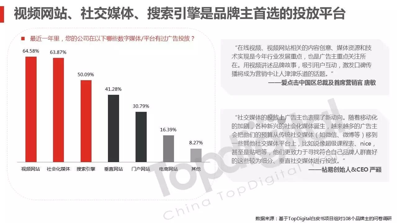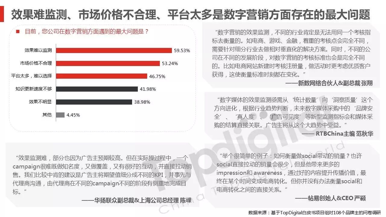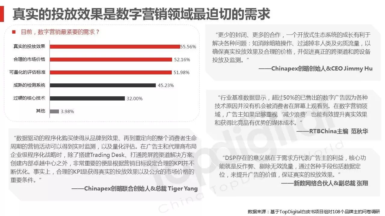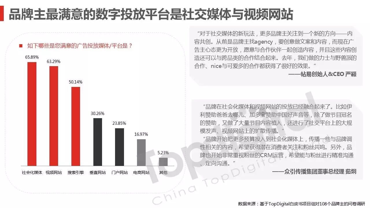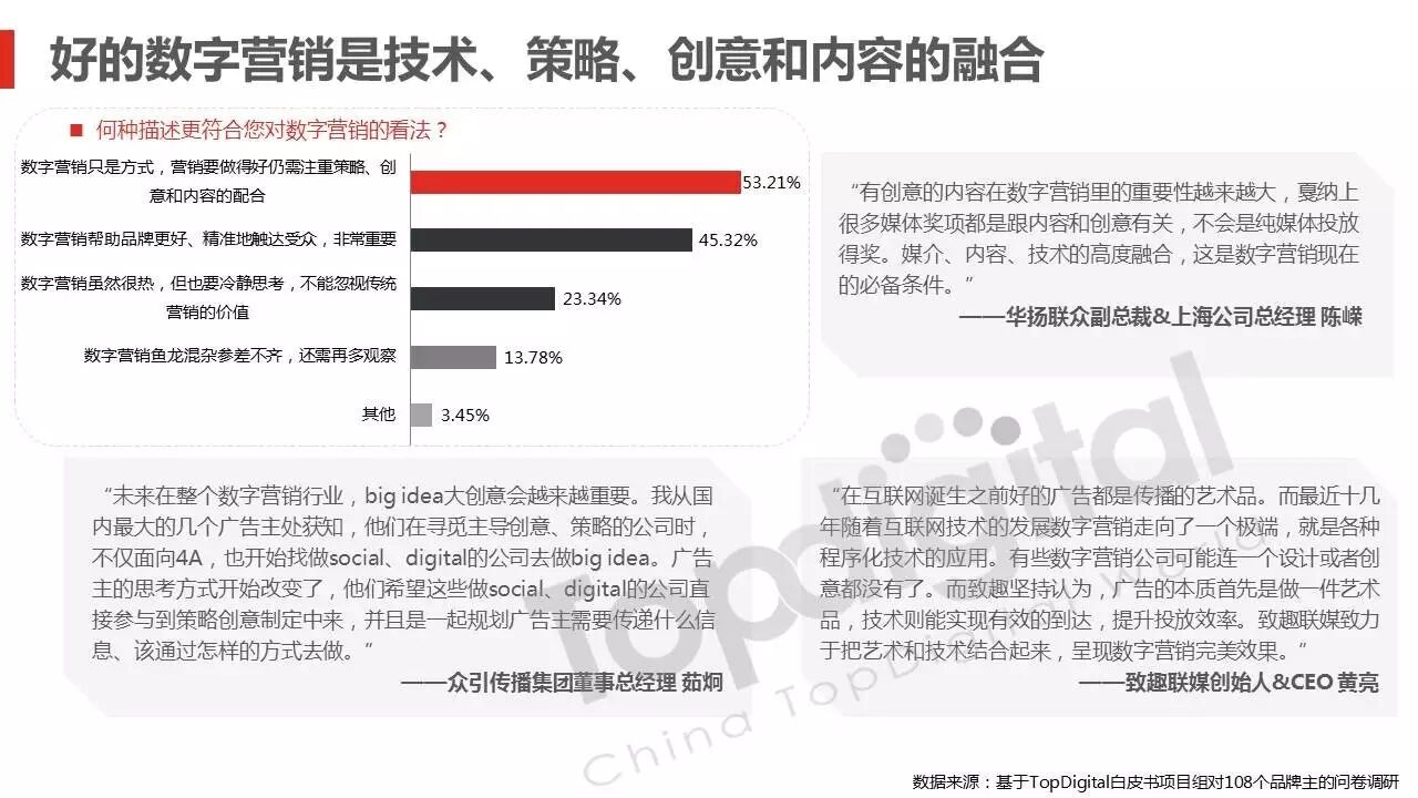 《2015-2016 TopDigital数字创新白皮书》发布,解读数字行业进化趋势 2016年4月8日 0 从2015到2016,伴随着移动端场景的延伸和数字技术的发展,数字传播领域也前所未有地热闹起来,AR&VR、跨屏、海淘和跨境购、移动支付等新玩法和新场景不断涌现和深化,超级“IP”出现,智能硬件、共享经济成为关注热点,新的营销渠道、新的沟通方式层出不穷。 面对这样的环境和市场格局,TopDigital研究院深入整个数字行业的品牌主、代理商、消费者和媒体进行了行业全景式研究和解读。在过去的一年里,品牌主开始变革思维不断前进;这也促使数字营销的代理商加快了升维创新的步伐;同时消费者的消费水平不断提高,品质生活导向的消费升级正在进行;而媒体正在进入衰亡、重生与创变的关键时刻…… 同时,这一份年度数字创新白皮书,延续了TopDigital研究院一贯的风格,除了数据的采集解读,也更多从“人”的角度出发,去理解和认识行业的发展进化。报告通过前期采访,吸收了众多行业大咖的真实观点和看法,对于现象的解读,也更多选择用生动的行业案例去表达和印证。 因此,他不是一份生产流水线的作业,他是行业的对话、思维和故事。 以下是报告全文: (友情提示:点击图片放大阅读体验更佳) 感谢所有合作伙伴的调研、观点、数据和案例支持! 点击这里,下载报告全文 2016年度第四届TopDigital 创新发布盛典将于6月30日在上海举办,行业一线品牌主、代理机构、主流媒体们将在此进行创新成果的发布,同期亦将启动2016-2017年数字创新白皮书,感兴趣的行业伙伴欢迎咨询。 TopDigital创新峰会合作,欢迎联系Jenny(小獒)。 联系电话/微信:131 2213 3598 邮箱:jenny@topdigitalworld.com QQ在线咨询:2779201923