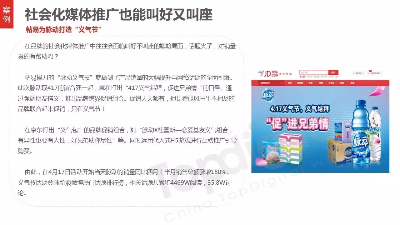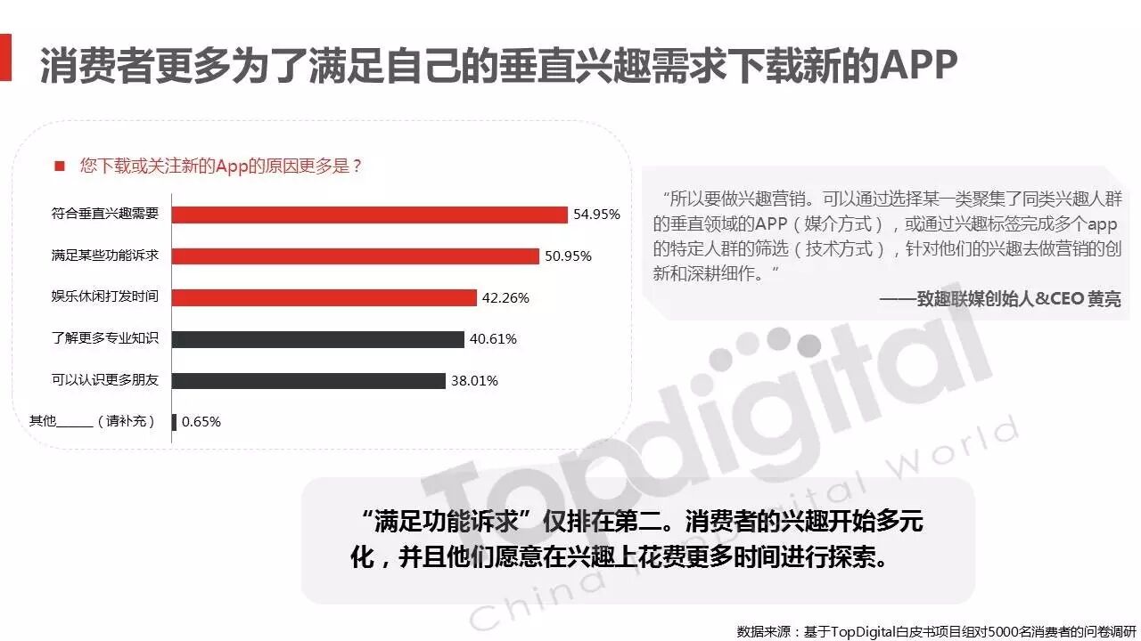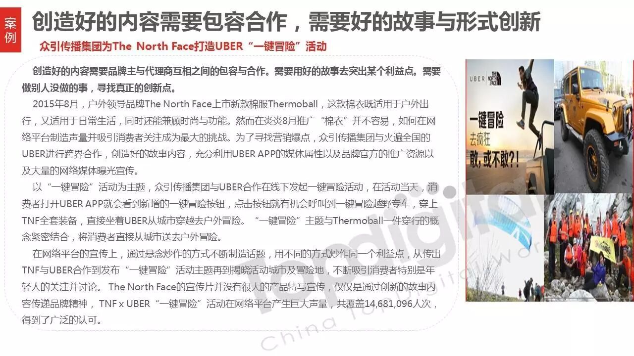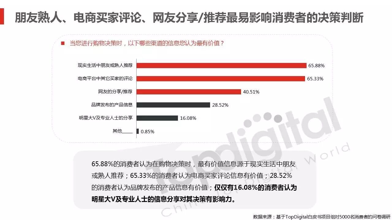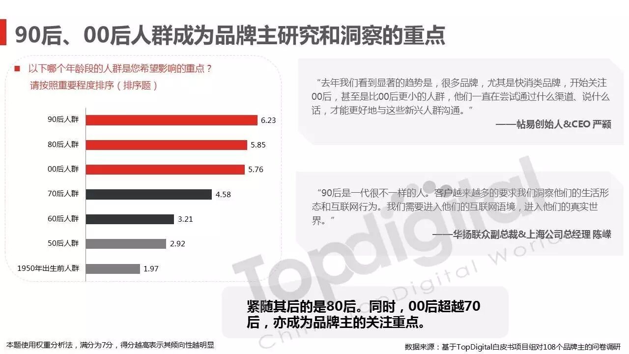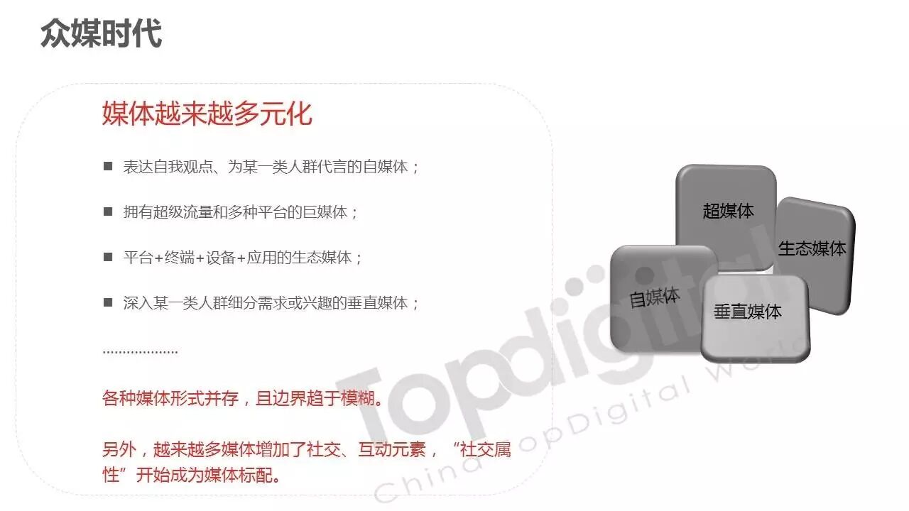 《2015-2016 TopDigital数字创新白皮书》发布,解读数字行业进化趋势 2016年4月8日 0 从2015到2016,伴随着移动端场景的延伸和数字技术的发展,数字传播领域也前所未有地热闹起来,AR&VR、跨屏、海淘和跨境购、移动支付等新玩法和新场景不断涌现和深化,超级“IP”出现,智能硬件、共享经济成为关注热点,新的营销渠道、新的沟通方式层出不穷。 面对这样的环境和市场格局,TopDigital研究院深入整个数字行业的品牌主、代理商、消费者和媒体进行了行业全景式研究和解读。在过去的一年里,品牌主开始变革思维不断前进;这也促使数字营销的代理商加快了升维创新的步伐;同时消费者的消费水平不断提高,品质生活导向的消费升级正在进行;而媒体正在进入衰亡、重生与创变的关键时刻…… 同时,这一份年度数字创新白皮书,延续了TopDigital研究院一贯的风格,除了数据的采集解读,也更多从“人”的角度出发,去理解和认识行业的发展进化。报告通过前期采访,吸收了众多行业大咖的真实观点和看法,对于现象的解读,也更多选择用生动的行业案例去表达和印证。 因此,他不是一份生产流水线的作业,他是行业的对话、思维和故事。 以下是报告全文: (友情提示:点击图片放大阅读体验更佳) 感谢所有合作伙伴的调研、观点、数据和案例支持! 点击这里,下载报告全文 2016年度第四届TopDigital 创新发布盛典将于6月30日在上海举办,行业一线品牌主、代理机构、主流媒体们将在此进行创新成果的发布,同期亦将启动2016-2017年数字创新白皮书,感兴趣的行业伙伴欢迎咨询。 TopDigital创新峰会合作,欢迎联系Jenny(小獒)。 联系电话/微信:131 2213 3598 邮箱:jenny@topdigitalworld.com QQ在线咨询:2779201923